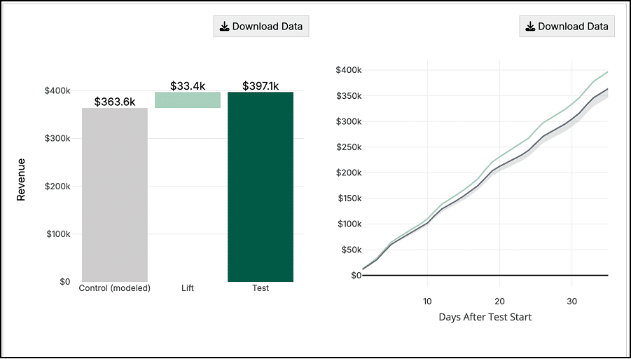 The line graph next to it shows how the test evolved over time, showing the cumulative revenue observed between test and control groups. In this case, we can see revenue from the test geographies separating further and further from the control geographies as the test progresses.