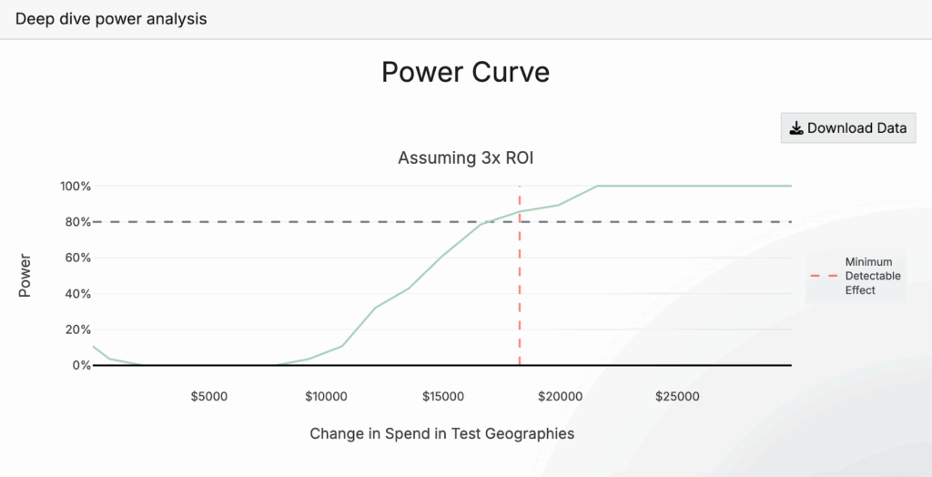 - The Power Curve (pictured below) will show you how much you need to adjust spend in brand search campaigns during the test period in order to achieve a statistically significant test. 80% power is the bare minimum we recommend, but often our baseline recommendation will be above this, as is the case in the image below. If the results aren’t sufficient, you can increase experiment length (while keeping daily spend change the same), increase spend amount, or increase the number of test geos. For more on how to think about experiment power, we recommend this section of our documentation.
