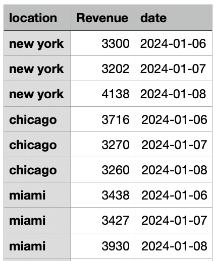 Follow the same process as Step 1 to organize data, but this time, the data you export should span from the earliest date included in the experiment design phase, all the way through to the end of the cooldown period. You will use the same columns (location, date, and KPI).