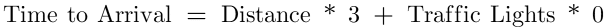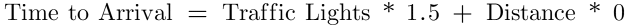 Take a look at these equations and use some of the values in the table above to solve for time to arrival. The equations are equally accurate in outputting the correct time to arrival. Even though one equation reduces the traffic light coefficient to 0 and the other reduces the distance coefficient to 0, both are able to represent the data with the same level of accuracy!