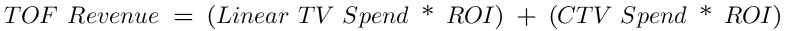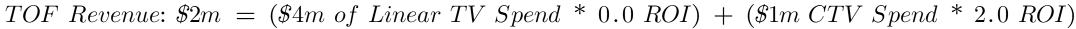 The “credit” for driving incremental revenue will go to either linear TV OR to CTV because the total revenue generated can be explained by either. And, if revenue is explained by one paid media channel, that means the other paid media channel must evaluate to 0 to retain an accurate prediction of your revenue. That would look something like this: