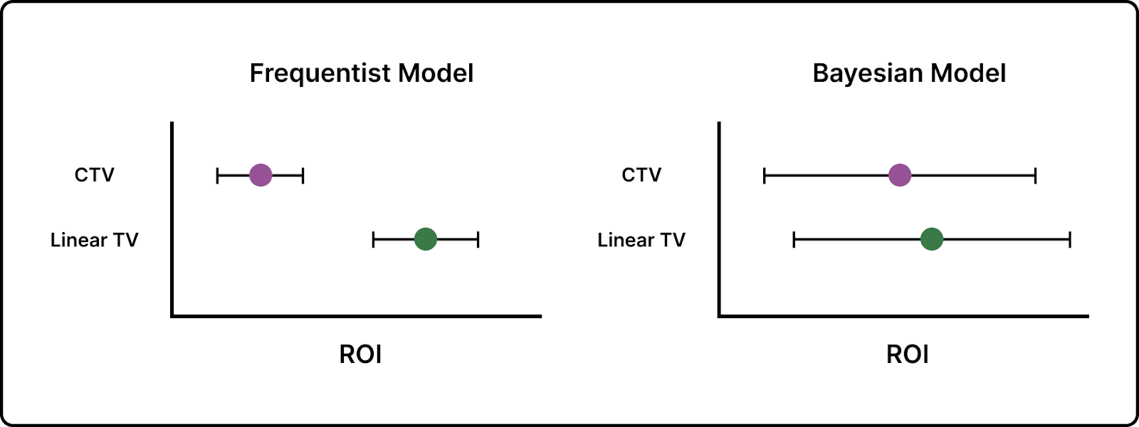 The frequentist model on the left assigns a much higher ROI to the Linear TV channel and a much lower ROI to the CTV channel. Those little tails represent uncertainty. So, overall, the frequentist model appears to believe, pretty strongly, that Linear TV is driving ROI. But what if the collinearity is creating a false positive? Remember, in a traditional regression like the frequentist model illustrated above, if credit goes to Linear TV, then the CTV ROI will tend toward 0 if those two channels are collinear. Since multicollinearity prevents a regression of this kind from finding accurate signal, both the ROI estimates and the uncertainty bands surrounding them are a misrepresentation of the true impact of your channel spend.