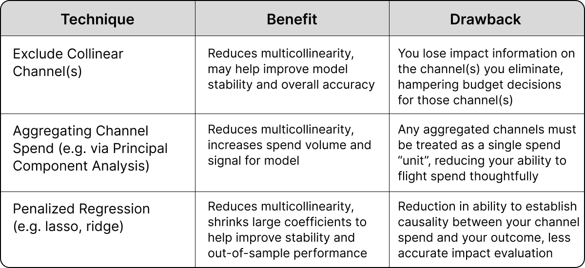 Thoughtful marketing spend flighting practices can help and are the most effective method for handling multicollinearity. In addition to strong spend variation practices, statistical methods designed to handle these challenges – like the Bayesian approaches used at Recast – can further reduce the impact multicollinearity has on your marketing measurement.