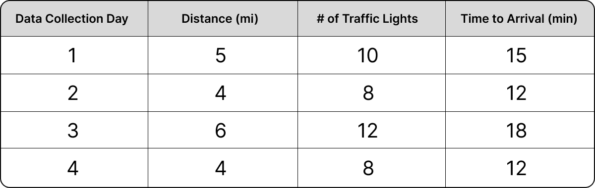 Let’s look at a practical example to help this make more sense. Imagine that you collect data on your morning commute for a month and that you live in a meticulously constructed neighborhood – we’ll call it TrafficTown – in which there are 2 traffic lights per mile. No matter which route you choose to take in TrafficTown, the number of traffic lights will always be equivalent to the number of miles traveled times 2. The data you collect on your commute looks something like this: